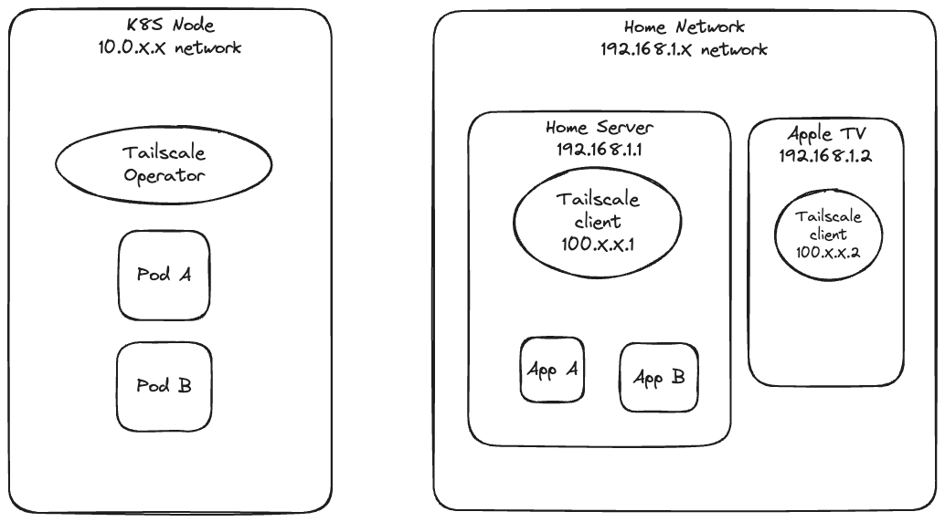 For more context, while I’ve been experimenting with kind and a virtual Kubernetes (K8S) cluster, I run a personal server running at home with plenty of resources and a virtual server that hosts my public web apps. Being able to connect the two servers over TS is one of my goals. It allows me to do more permanent and resource intensive things on my personal server, but also make them available publicly when I want.